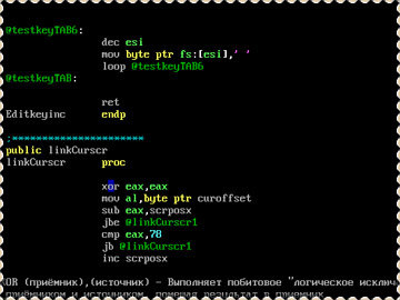Небольшой редактор с подсветкой синтаксиса для языка ассемблер, дополнительно отображает в нижней строке описание команды или ее операнда, на которые указывает курсор.