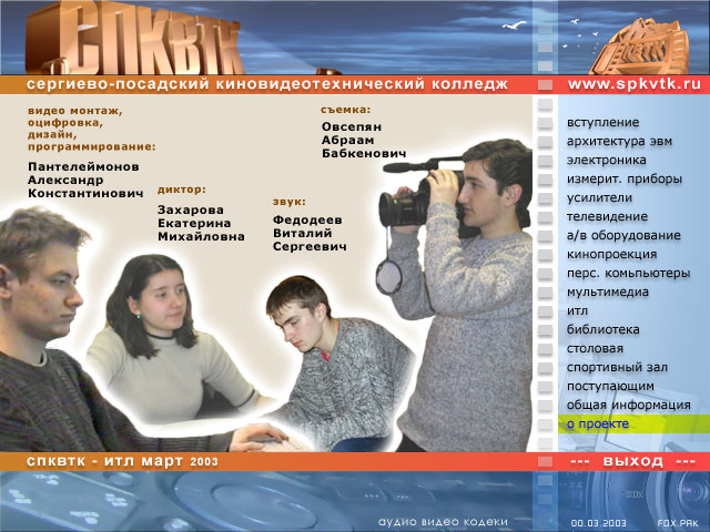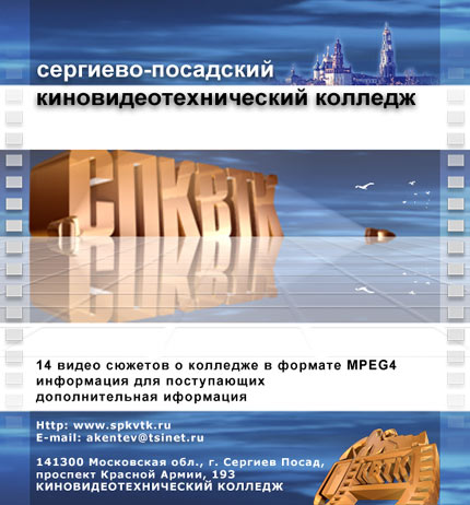 Дипломный проект для Киновидеотехнического колледжа. Включает в себя ряд презентационных видеороликов, для хранения на специализированных СD, объемом 50 мегабайт, формата визитки.
